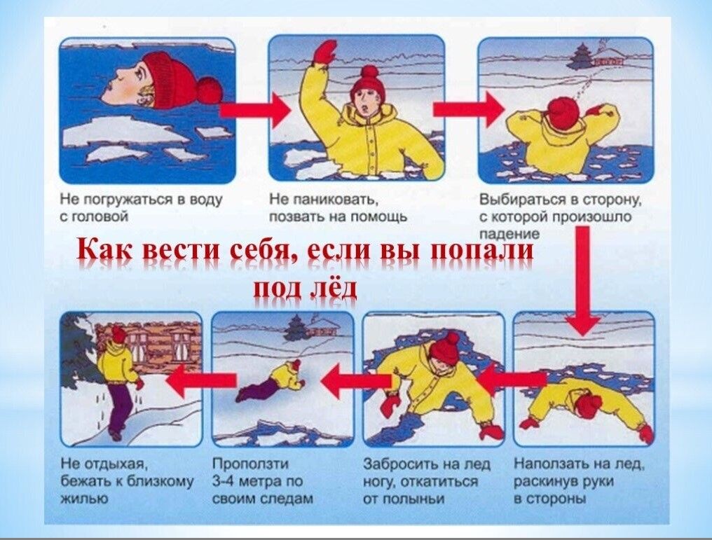 - Выбирайтесь из полыньи, перекатываясь, а затем двигайтесь ползком в ту сторону, откуда шли.