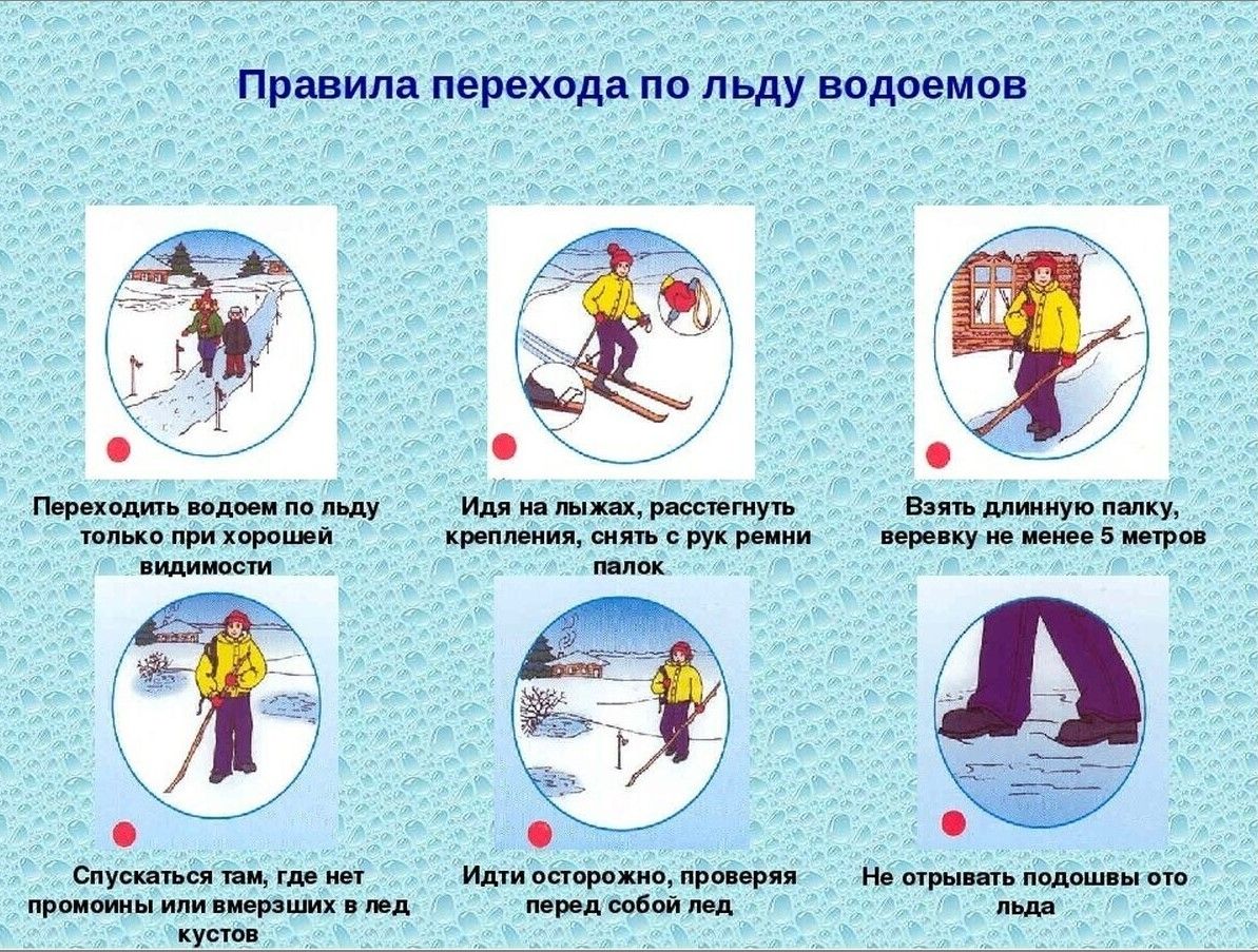 - Замерзшую реку (озеро) лучше перейти на лыжах, при этом: необходимо двигаться медленно; лыжные палки держите в руках, не накидывая петли на кисти рук, чтобы в случае опасности сразу их отбросить.
