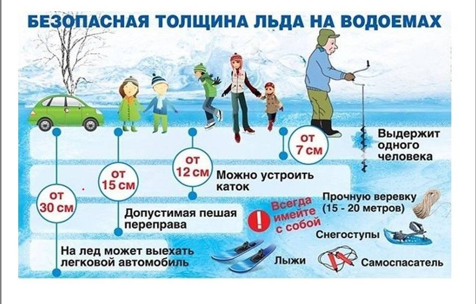 Выходить на лед можно только тогда, когда его толщина достигает не менее 10 сантиметров в пресной воде и 15 сантиметров в соленой.